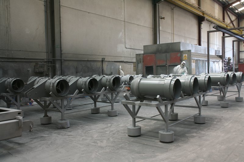 Realizamos tratamientos superficiales con chorro de granalla metálica de piezas. Disponemos de una cabina de dimensiones 10m.x4m.x4m. y una capacidad de hasta 20Tn. También aplicamos tratamientos anticorrosivos mediante aplicación de pinturas alcídicas, clorocauchos, epoxys, poliuretanos, silicatos, vinilos, etc.…. Tanto a mano como mediante sistemas “airless”. Asimismo disponemos de una cabina de secado de dimensiones 6m.x3,5m.x2,4m. para agilizar el curado en procesos continuos de tratamientos superficiales. |